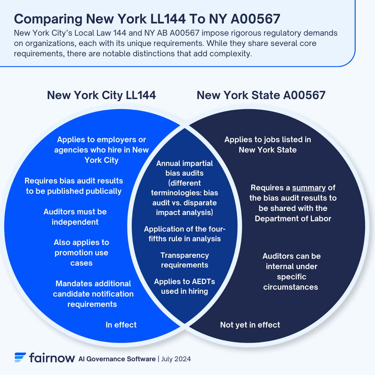 - Staying compliant with NYC Local Law 144 involves a structured audit process, clear documentation, and ongoing oversight. To streamline these tasks and ensure consistency, many organizations turn to FairNow’s AI governance platform — a centralized solution that automates regulatory tracking, bias assessments, and compliance workflows across all your AI systems.